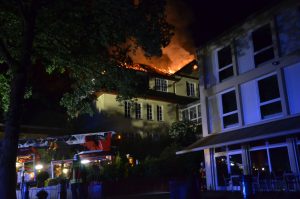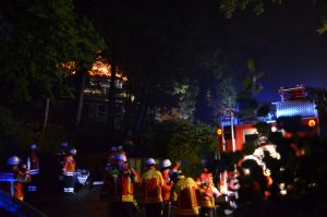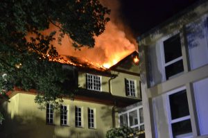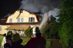 Gegen 23 Uhr schlug ein Blitz in das Dach des Hauptgebäudes des Gutes Eddelsen ein. Kurze Zeit später stand der gesamte Dachstuhl des fast 100-jährigen außerhalb der Ortschaft gelegenen Gebäudes in Vollbrand. Umgehend wurden mehrere Feuerwehren aus dem Unwettereinsatz herausgelöst und nach Eddelsen entsandt. Im Innen- und Außenangriff wurde mit der Brandbekämpfung begonnen. Die Drehleiter der FF Meckelfeld wurde auf der engen und steilen Zufahrt zum Gebäude in Stellung gebracht, um das Feuer auch von oben angreifen zu können. Zur Wasserversorgung der Einsatzstelle wurde eine Schlauchleitung aus der Ortschaft zum Brandobjekt verlegt. Unter Leitung von Gemeindebrandmeister Rainer Wendt waren in Spitzenzeiten über 150 Feuerwehrleute eingesetzt. Kreisbrandmeister Volker Bellmann machte sich vor Ort ein Bild von den Löscharbeiten.