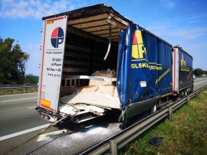 Maschen Erneut hat ein schwerer Auffahrunfall auf der BAB A 1, Richtungsfahrbahn Hamburg, zwischen dem Maschener Kreuz und der Anschlussstelle Harburg den Einsatz der Freiwilligen Feuerwehr Maschen gefordert. Die Feuerwehr war am Montag um 11.04 Uhr gemeinsam mit einem Rettungswagen und dem Notarzt des DRK zu dem Verkehrsunfall mit zwei beteiligten LKW ( ein Gliederlzug und ein LKW ) und einer vermeintlich eingeklemmten Person alarmiert worden. Beim Eintreffen der ersten Einsatzkräfte an der Unfallstelle war schnell klar, dass keine Personen mehr in den auf dem Seitenstreifen zum Stehen gekommenen Fahrzeugen eingeklemmt waren. Der Fahrer des auffahrenden LKW wurde im Seitenraum neben der Unfallstelle von Mitarbeitern des Rettungsdienstes versorgt, er wurde nach weiteren notärztlichen Maßnahmen einem umliegenden Hamburger Krankenhaus zur weiteren Versorgung zugeführt. Die Aufprallwucht muss dabei so stark gewesen sein, das einem der beiden beteiligten LKW Teile der Achse samt Rad herausgerissen worden sind. Zudem wurde der Anhänger des Gliederzugs im Heckbereich vollständig aufgerissen und zerstört. Aus den beteiligten Fahrzeugen liefen größere Mengen an Kraftstoff aus und verschmutzten die Fahrbahn. Mit Hilfe von Ölbindemitteln streuten die Kräfte der FF Maschen die ausgelaufenen Kraftstoffe großflächig ab. Für die Feuerwehr war der Einsatz nach gut einer Stunde beendet. Für die Dauer der Rettungs- und Aufräumarbeiten wurden Teile der A 1 in Richtung Hamburg gesperrt, es kam zur Staubildung. Die Höhe des entstandenen Sachschadens und die genaue Unfallursache sind nun Gegenstand von Ermittlungen der Autobahnpolizei Winsen. -kpw-