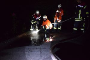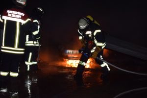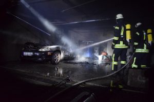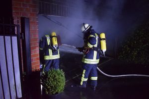 Thieshope. Zu einem Garagenbrand in Thieshope mussten in der Nacht von Freitag auf Samstag die Freiwilligen Feuerwehren aus Thieshope, Brackel und Tangendorf sowie der Einsatzleitwagen der Samtgemeinde Hanstedt ausrücken. In einer Doppelgarage in der Straße „Thieshoper Neuland“ hatte sich aus bislang ungeklärter Ursache ein in der Garage geparkter PKW entzündet. Aufmerksame Nachbarn bemerkten den Brand gegen 2:45 Uhr und wählten umgehend den Notruf. Die Leitstelle beorderte daraufhin, neben den oben genannten Freiwilligen Feuerwehren, auch die Polizei zur Einsatzstelle. Innerhalb weniger Minuten waren die Einsatzkräfte vor Ort. Insgesamt fünf der gut 40 ausgerückten Feuerwehrkräfte gingen unter umluftunabhängigem Atemschutz vor, um den Brand zu löschen. Hierzu musste zunächst das geschlossene Garagentor gewaltsam geöffnet werden. Mit einem C-Strahlrohr wurde der Brand zügig abgelöscht. Dabei musste eine in der Garage befindliche Gasflasche gekühlt und aus dem Gebäude gebracht werden. Der Brand hatte sich durch ein Regenfallrohr auch auf Teile des Daches ausgebreitet. Daher wurden Teile der Dachabdichtung geöffnet, um die letzten Brandnester ablöschen zu können. Nach rund einer Stunde konnten die ersten Einsatzkräfte aus dem Einsatz entlassen werden. Die Kräfte der Wehren Thieshope und Brackel leisteten noch eine Weile Brandwache und kühlten Fahrzeug und Garage mit Wasser, um ein erneutes Aufflammen zu verhindern. Die Polizei nahm die Ermittlungen zur Brandursache und Schadenshöhe auf.