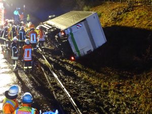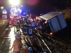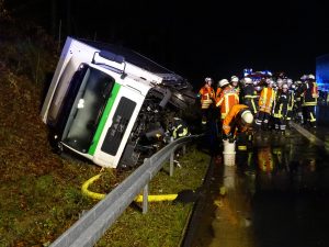 ist das Fahrzeug umgestürzt und ist auf der Seite, in einer Böschung der Autobahn, liegen geblieben. Der Fahrer des LKW ist dabei leicht verletzt worden. Die Einsat kräfte der Feuerwehr fingen die auslaufenden Betriebsstoffe auf und bereits ausgelaufene Stoffe wurden mit Bindemitteln abgestreut. Für die Feuerwehren war damit der Einsatz beendet. Warum der Fahrer mit seinem Fahrzeug von der Fahrbahn abgekommen ist und die Höhe des entstanden Schaden muss nun die Polizei ermitteln.