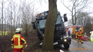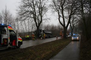 Am Montag dem 12.März ereignete sich auf der Landesstrasse 235 zwischen den Ortschaften Daerstorf und Elstorf in der Gemeinde Neu Wulmstorf ein schwerer LKW Unfall. Der Fahrer eines mit Bauschutt beladenen LKW geriet mit der rechten Seite in den Seitenstreifen der Fahrbahn und kollidierte dort anschließend mit einem Baum. Der Fahrer des LKW konnte sich mit Hilfe von Ersthelfern glücklicherweise selbständig aus dem Fahrzeug befreien und benötigte nach einer Untersuchung vor Ort durch den Rettungsdienst keine weitere Ärztliche Hilfe. Die L 235 wurde von der Polizei bis zur Bergung des Fahrzeuges durch ein Bergungsunternehmen für fast 7 Stunden voll gesperrt. Die Freiwillige Feuerwehr Elstorf stellte den Brandschutz sicher und nahm auslaufende Betriebsstoffe auf.