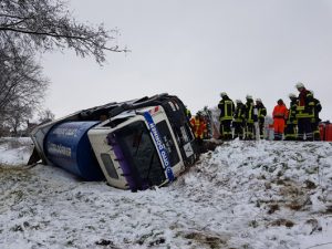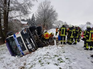 Ein spektakulärer Verkehrsunfall ereignete isch in der Straße „Achterdeich“ in Stelle. Dort war gegen 11.45 Uhr ein mit drei Personen besetzter Müllentsorgungs-LKW von der spiegelglatten Straße abgekommen, war einen kleinen Deich heruntergestürzt und blieb schließlich auf der Seite unterhalb des Deiches liegen. Alle drei Insassen konnten sich unverletzt aus dem Müllwagen befreien. Da jedoch zunächst angenommen wurde, dass durch den Unfall Personen in Fahrzeug eingeklemmt und verletzt worden seien, wurden durch die Winsener Rettungsleitstelle neben Rettungswagen und dem Notarzt des DRK auch die Freiwillige Feuerwehr Stelle sowie der Rüstwagen der Feuerwehr Winsen zu dem Unfall alarmiert. Beim Eintreffen der ersten Einsatzkräfte konnte dann aber schnell Entwarnung gegeben werden, alle drei Fahrzeuginsassen waren wohlauf und standen abseits des auf der Seite liegenden Müllwagens. Die Kräfte des Rettungsdienstes konnten somit den Einsatz abbrechen. Da aus dem Fahrzeugtank Dieselkraftstoff auslief, wurde zusätzlich die Feuerwehr Maschen mit Spezialfahrzeugen zur Bekämpfung von Umweltschäden nachalarmiert. Nach deren Eintreffen wurde m it Hilfe einer speziellen Umfüllpumpe der restliche im Tank befindliche Dieselkraftstoff aus dem Tank in bereitstehende Spezialfässer umgepumpt, und so eine großflächige Umweltverschmutzung verhinertn. Für die letzten Feuerwehrkräfte war der Einsatz erst am Donnerstagabend beendet, die Bergung des verunfallten Müllwagens wurde mit Hilfe von Kranfahrzeugen vorgenommen. An dem Fahrzeug entstand erheblicher Sachschaden.