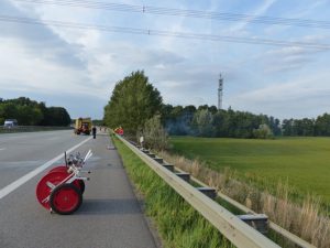 Am Sonnabend abend erfolgte dan ein Großeinsatz von Feuerwehren aus Niedersachsen und Hamburg. Um 18.10 Uhr waren die Freiwilligen Feuerwehren aus Maschen, Fleestedt und Ohlendorf sowie Kräfte der Berufs- und Freiwilligen Feuerwehr Hamburg zu einem ausgedehnten Böschungsbrand auf die BAB A 1, Richtungsfahrbahn Hamburg zwischen dem Maschener Kreuz und der Anschlussstelle Harburg alarmiert worden. Beim Eintreffen der Einsatzkräfte brannten mehrere hundert Quadratmeter Autobahnböschung sowie der Mittelstreifen. Mit mehreren Strahlrohren wurde der Brand bekämpft und war schon nach kurzer Zeit unter Kontrolle, die Nachlöscharbeiten zogen sich eine längere eit hin. Für de Feuerwehren war der Einsatz nach eineinhalb Stunden beendet. De Brandursache ist ungeklärt, die Polizei hat die Ermittlungen aufgenommen.