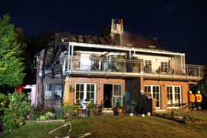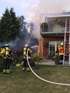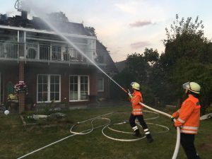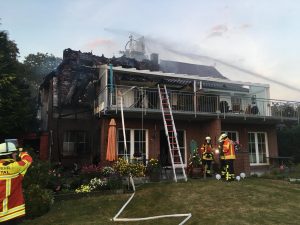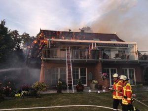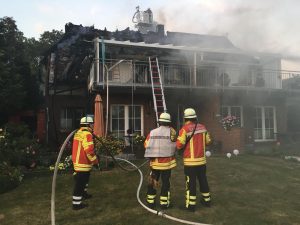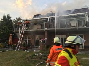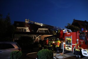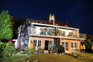 Metzendorf Hoher Sachschaden entstand bei Brand eines Doppelhauses am Mittwochabend in der Metzendorfer Straße im Seevetaler Ortsteil Metzendorf. Dorthin waren um 18.24 Uhr die Freiwilligen Feuerwehren aus Beckedorf/Metzendorf und Fleestedt durch die Winsener Rettungsleitstelle zu einem vermeintlichen Schuppenbrandalarmiert worden. Schon afu der Anfahrt konnten sich die Einsatzkräfte an einer dichten Rauchentwicklung über der Brandstelle orientieren. Beim Eintreffen der ersten Einsatzkräfte brannte ein direkt an das Doppelhaus mit vier Wohnpartien angrenzender Schuppen in voller Ausdehnung, das Feuer hatte auch schon auf den Dachstuhl übergegriffen, Teile der Wohnung und der Dachstuhl brannten ebenfalls in voller Ausdehnung. Unverzüglich wurde eine Nachalarmierung weiterer Feuerwehren aus Hittfeld und LIndhorst sowie wenig später aus Moor vorgenommen. Auch die Drehleiter der Feuerwehr Meckelfeld kam zum Einsatz. In Spitzenzeiten waren 90 Feuerwehrleute der sechs Feuerwehren unter der Leitung von Beckedorfs Ortsbrandmeister Mathias Schwab im Einsatz. Mit einem von mehreren Seiten vorgetragenen Löschangriff gingen die Einsatzkräfte zur Brandbekämpfung vor. 20 der eingesetzten Feuerwehrleute gingen dabei unter umluftunabhängigen Atemschutz vor. Mit Hilfe von sechs C-Strahlrohren sowie einem Wenderohr über die Drehleiter wurde die Brandbekämpfung durchgeführt, der Feuerwehr gelang es dabei, das Feuer auf den Dachstuhl der einen Doppelhaushälfte sowie die darunter liegende Wohnung zu begrenzen. Für die Absuche nach weiteren Brandnestern mussten aber große Teile auch des anderen Dachstuhls geöffnet werden. Mit Hilfe mehrerer Wärmebildkameras wurde immer wieder eine Kontrolle durchgeführt. Bis in die späten Abendstunden hinein dauerten die Nachlöscharbeiten an. Eine Hausbewohnerin erlitt bei dem Einsatz einen Schwächeanfall, sie musste mit einem Rettungswagen in ein Krankenhaus gebracht werden. Durch das Feuer wurde das Gebäude unbewohnbar, die Wohnung im Dach samt Dachstuhl brannte aus, die drei andreen Wohnungen wurden durch Rauch, Russ und Löschwasser in Mitleidenschaft gezogen. Die Polizei hat die Brandstelle beschlagnahmt und wird nach Abkühlen der Brandstelle mit den Ermittlungen zur genauen Brandursache und zur Höhe des entstandenen Sachschadens beginnen. Die brandbetroffenen Bewohner wurden anderweitig untergebracht.
