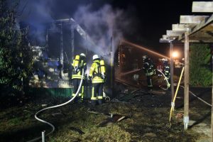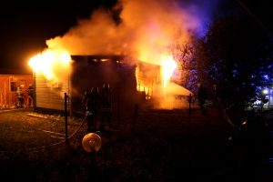 Hoopte. Großalarm für die Wehren Hoopte, Stöckte, Winsen, Laßrönne und Fliegenberg in der Nacht von Dienstag auf Mittwoch. In Hoopte brannte ein in Holzbauweise errichtetes Ferienheim, direkt neben einem Wohnhaus. Da zunächst angenommen wurde das auf dem gleichen Gelände befindliche Gasthaus würde brennen, wurden gleich fünf Feuerwehren zu der Einsatzstelle alarmiert. Schon auf der Anfahrt war für die Einsatzkräfte der Feuerschein von weitem sichtbar. Bei dem Eintreffen der ersten Kräfte stellte sich heraus, das nicht das Gasthaus, sondern ein in der Nähe befindliches Ferienheim in voller Ausdehnung brannte. Gefährdet waren ein Wohnhaus und ein weiteres Gebäude, die sich in unmittelbarer Nähe zum Brandobjekt befanden. Eine Person wurde von der Feuerwehr mit leichten Verletzungen erstversorgt und dem Rettungsdienst übergeben. Die Feuerwehr konzentrierte sich zunächst auf den Schutz der umliegenden Gebäude. Zur Brandbekämpfung wurden insgesamt vier Strahlrohre vorgenommen. Der Einsatz der Strahlrohre zeigte schnell Wirkung. Nach gut einer halben Stunde war der Brand soweit unter Kontrolle, so das keine weitere Gefahr der Brandausweitung mehr bestand. Nach gut einer Stunde konnten die ersten Wehren aus dem Einsatz entlassen werden. Die Löschwasserversorgung erfolgte neben der Wasserentnahme aus Hydranten auch vom Ilmenaukanal aus. Dafür wurde von den Feuerwehrleuten Schlauchleitungen verlegt. Die Nachlöscharbeiten für die Hoopter Wehr zogen sich noch über einen längeren Zeitraum hin, da immer wieder kleinere Brandnester aufflackerten und abgelöscht werden mussten. Vor Ort machten sich Stadtbrandmeister Uwe Ehlers und sein Stellvertreter Jans-Peter Wreide ein Bild von der Lage. Insgesamt waren ungefähr 90 Feuerwehrleute mit zwölf Fahrzeugen im Einsatz. Die Ermittlungen zur Brandursache und Schadendhöhe hat die Polizei übernommen.