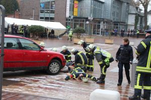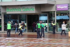 Buchholz Eine komplexe Übungslage für unzählige Polizisten und Helfer des Rettungsdienstes sowie Mitgliedern mehrerer Freiwilliger Feuerwehren aus dem Stadtgebiet Buchholz sowie vom Fachzug „Führung und Kommunikation“ der Kreisfeuerwehr des Landkreises Harburg hat sich jetzt allen 350 Beteiligten am Einkaufscenter „Buchholz Galaerie“ in Buchholz i.d.N. ( LK Harburg ) dargestellt. Nach den Übungsvorgaben der Polizeiinspektion Landkreis Harburg sollte es dort zu einem Einsatz mit „lebensbedrohlicher Gefährdungslage“ für alle beteiligten Einsatzkräfte gekommen sein. Bei einem simulierten Volksfest war ein mit zwei Personen besetzter PKW in eine Menschenmenge gefahren und hatte dort zwei Menschen überfahren, eine Person klemmte unter dem Fahrzeug fest. Die beiden ( von Polizeibeamten gespielten ) „Täter“ flüchteten danach in das nahegelegene Einkaufscenter und eröffneten dort das Feuer aus Schnellschusswaffen auf ( von Freiwilligen Feuerwehrleuten gespielten ) Passanten. Erste Notrufe besagten lediglich, dass es in der Fußgängerzone vor dem Einkaufszentrum zu einem Verkehrsunfall mit einer eingeklemmten Person gekommen sein sollte. Daraufhin wurden Kräfte und Fahrzeuge der Freiwilligen Feuerwehr Buchholz sowie ein Rettungswagen und ein Notarzt zur „Unfallstelle“ entsandt. Beim Eintreffen der Einsatzkräfte vor Ort wurden sie allerdings von den vermeintlichen Terroristen sofort beschossen, ein Feuerwehrmann wurde dabei von den ( aus ausnahmslos Platzpatronen bestehenden ) Kugeln getroffen und blieb ebenso wie ein Polizist am Unfallfahrzeug liegen. Der Einsatzleiter ordnete für alle Kräfte den sofortigen Rückzug an und veranlasste eine umfangreiche Nachalarmierung von Kräften der Feuerwehr und des Rettungsdienstes mit dem Stichwort „Massenanfall von Verletzten – höchste Stufe“. Neben Schnelleinsatzgruppen von DRK und JUH mit 100 Helfern wurden Feuerwehrkräfte der Feuerwehren aus Dibbersen, Sprötze und Trelde nachalarmi8ert, ebenso wie der Fachzug „Führung&Kommunikation“ der Kreisfeuerwehr. Alle Kräfte nahmen zunächst weit aus der Reichweite des  von dem Verbrechens betroffenen Einsatzort Aufstellung und warteten das Eingreifen der Polizei ab. Diese stürmte mit dutzenden Einsatzkräften das Einkaufszentrum, evakuierte von dort viele „Betroffene“ und brachte „Verletzte“ ins Freie. Alle Verletzten wurden mit polizeilicher Begleitung in zwei sichere Zonen weit vom Einkaufszentrum entfernt in Sicherheit gebracht und dort umfangreich von den Einsatzkräften der Feuerwehr und des Rettungsdienstes versorgt. Zudem wurden beide Verbrecher nach kurzer Jagd durch das Zentrum gestellt und unschädlich gemacht. Danach lief die große Rettungsaktion an. An den Behandlungsplätzen wurden immer mehr Verletzte gebracht, nach den unterschiedlichen Kategorien „rot“ ( lebensbedrohlich verletzt ), „gelb (mittelschwer- bis schwer verletzt) und „grün“ ( leichter verletzt bzw. gehfähig) katalogisiert und behandelt. Mit unzähligen Rettungswagen wurden die Verletzten weitertransportiert. Die Feuerwehren befreiten weiterhin die „eingeklemmte Person“ unter dem PKW, barg die vor dem Zentrum liegenden Personen und führte umfangreiche Erstversorgungsmaßnahmen und andere Hilfeleistungen für den Rettungsdienst durch. Der Fachzug „Führung&Kommunikation“ stellte währenddessen die Kommunikation zwischen der Feuerwehr, den Kräften des Rettungsdienstes und der Polizei sicher und übernahm den laufenden Funkverkehr. Unter den aufmerksamen Blicken vieler Beobachter, darunter Landrat Rainer Rempe, Buchholz Bürgermeister Jan-Hendrik Röhse, dem stellvertretenden Kreisbrandmeister Torsten Lorenzen, Buchholz Stadtbrandmeister André Emme, dem Leiter des DRK Rettungsdienstes des Landkreises Harburg Ulrich Beecken und seinem Stellvertreter Jan Gagelmann, dem Leiter der Polizeiinspektion Harburg Uwe Lehne sowie vielen anderen Leitern umliegender Polizeiinspektionen aber auch einem guten Dutzend Medienvertreter dauerte die Übung gut zweieinhalb Stunden an, ehe auch die letzte Übungsvorgabe erfüllt war. Alle Teilnehmer wurden mit heißen Getränken und einem warmen Imbiss für ihre Arbeit entschädigt. Ein gemeinsames Fazit wurde derzeit noch nicht gezogen, in diversen Auswertungen wird die Übung im Nachhinein von allen beteiligten Organisationen und der Polizei aufgearbeitet und ausgewertet.       -kpw-