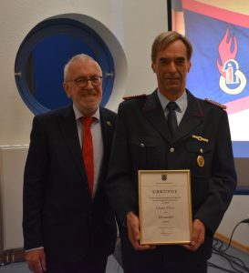 Unter den geladenen Gästen war auch Neu Wulmstorfs Bürgermeister Wolf-Egbert Rosenzweig, der dem Ehrenortsbrandmeister und im Gründungsjahr amtierenden Ortsbrandmeister Claus Viets die Ehrennadel der Gemeinde Neu Wulmstorf für seine geleisteten Dienste verlieh.