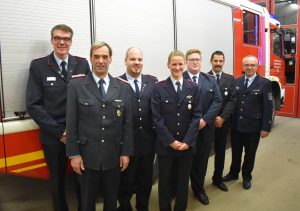 Kreisbrandmeister Volker Bellmann und der stellvertretende Gemeindebrandmeister Olaf Bruhn betonten die Wichtigkeit der Jugendfeuerwehr und hatten die würdevolle Aufgabe, Christina Westenberg, Stefan Viets und Martin Busch, die seit dem Gründungsjahr Mitglied in der Freiwilligen Feuerwehr Rade sind, für 25-jährige aktive Mitgliedschaft zu ehren. Ebenso wurde der amtierende Jugendwart Robin Holst zum Löschmeister befördert.