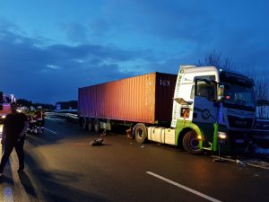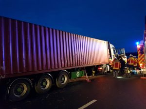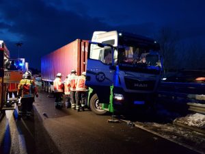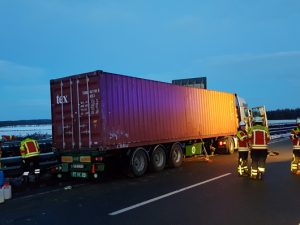 26.02.18 : LKW Unfall auf der A 7 fordert Seevetaler Feuerwehren – Dieseltank riss bei Aufprall auf Mittelschutzplanke