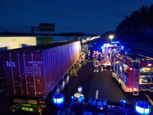 Ramelsloh Ein Verletzter und ein schwer beschädgter Sattelzug sind die Bilanz eines PLKW Unfalls am Montag abend auf der BAB A 7, Richtungsfahrbahn Hannover kurz hinter der Anschlussstelle Ramelsloh. Dabei war kurz vor 18.00 Uhr aus bislang noch nicht geklärter Ursache der Fahrer eines Sattelzuges aus dem raum Leipzig von der rechten Fahrspur auf die linke Fahrspur geraten. Dort prallte der Sattelzug in die Mittelschutzplanke, durch den Aufprall riss der Dieseltank auf, Dieselkraftstoff trat aus. Da zunächst vermutet wurde, dass der Fahrer bei dem Unfall eingeklemmt worden sein sollte, wurden durch die Winsener Rettungsleitstelle neben einem Rettungswagen und dem Notarzt des DRK die Freiwilligen Feuerwehren aus Ohlendorf und Maschen zu diesem Unfall alarmiert. Bei Eintreffen der ersten Einsatzkräfte konnte schnell Entwarnung gegeben werden, der Fahrer war nicht eingeklemmt und konnte seine Fahrerkabine selbständig verlassen. Er wurde bis zum Eintreffen des Rettungsdienstes von Ersthelfern betreut. Der Mann wurde nach einer medizinischen Erstbetreuung durch die Besatzung des Rettungswagens in ein umliegendes Krankenhaus verbracht. Die Feuerwehrkräfte streuten derweil den im Bereich der Mittelschutzplanke ausgelaufene Dieselkraftstoff mit Ölbindemitteln ab. Parallel wurde mit Hilfe einer speziellen Ölumfüllpumpe der doppelte Dieseltank abgepumpt und so ein weiteres Austreten des Dieselkraftstoffes verhindert. Rund 400 Liter Dieselkraftstoff fingen die Feuerwehrkräfte auf. Nach gut eineinhalb Stunden konnten die Einsatzkräfte die Unfallstelle verlassen. Die A 7 musste für die Dauer der Bergungs- und Aufräumarbeiten voll gesperrt werden, es bildete sich im Feierabendverkehr ein kilometerlanger Rückstau. Der verunfallte Sattelzug wurde von einem Abschleppunternehmen geborgen. Die Autobahnpolizei Winsen hat die weiteren Ermittlungen übernommen.