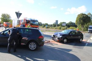 Parallel zu dem Einsatz in Iddensen ereignete sich in Hittfeld um 15.00 Uhr ein weiterer Verkehrsunfall. Dabei waren im Kreuzungsbereich Maschener Straße/Unner de Bult ein PKW Ford und ein PKW VW Golf miteinander kollidiert. Da aus einem der beiden verunfallten Fahrzeuge Betriebsstoffe ausliefen du die Straße verschmutzten, wurde neben einem Rettungswagen des DRK auch die Freiwillige Feuerwehr Hittfeld zur Hilfeleistung alarmiert. Zwei Fahrzeuginsassen erlitten bei dem Unfall leichte Verletzungen, sie wurden durch Hittfelder Feuerwehrleute bis zum Eintreffen des Rettungsdienstes versorgt, im Anschluss kamen beide in ein umliegendes Krankenhaus. Die Kräfte der Feuerwehr streuten derweil die ausgelaufenen Betriebsstoffe ab. Auch hier hat die Polizei die weiteren Ermittlungen übernommen. -kpw-