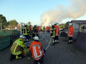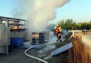 Hoopte. Zu einem Feuer in der Fischaufzuchtanlage am Hoopter Elbdeich wurden am frühen Pfingstmontag die Feuerwehren Hoopte, Stöckte, Lassrönne, Fliegenberg und Winsen alarmiert. Bereits auf der Anfahrt war eine dunkle schwarze Rauchsäule zuerkennen. Bei dem Eintreffen der ersten Kräfte vor Ort, brannten zwei mit Kunstkopf-Kügelchen befüllte Behälter. Die Kügelchen dienen zur Aufbereitung und Reinigung des Wassers in den Fisch- aufzuchtbecken. Die ersten Feuerwehrleute gingen unter Atemschutz mit einem Schaumrohr zur Brandbekämpfung vor. Schon nach kurzer Zeit zeigten sich erste Löscherfolge und das Feuer konnte eingedämmt werden. Da die Holzumrandung des in unmittelbarer Nähe stehenden Beckens auch bereits Feuer gefangen hatte, wurde ein zweiter Trupp unter Atemschutz mit einem Strahlrohr zur Bekämpfung des Feuers eingesetzt. Dabei musste vorsichtig vorgegangen werden, damit kein verunreinigtes Löschwasser in das Becken gelangt. In dem betroffenen Becken befanden sich wertvolle Fische. Die ersten Kräfte konnten noch gut 45 Minuten die Einsatzstelle verlassen. Die Feuerwehren aus Hoopte und Stöckte verblieben noch geraume Zeit an der Einsatzstelle. Durch den schnellen Einsatz der Wehren konnte in der Aufzuchtsanlage ein großer Schaden verhindert werden. Zur genauen Brandursache und Schadenshöhe hat die Polizei Winsen die Ermittlungen aufgenommen.