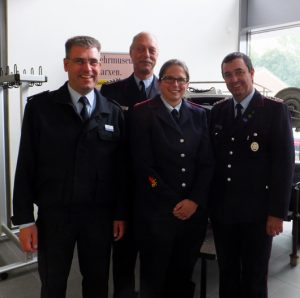 Hittfeld Eine besondere Überraschung hatte der stellvertretende Kreisbrandmeister Torsten Lorenzen jetzt bei der Abnahme des zweiten Maschinisten Lehrgang in der Tasche. Nachdem er den Teilnehmern zum bestandenen Lehrgang gratuliert hatte, bat er die Kreisausbilderin Maureen Seitz zu sich. Auf Grund ihrer Dienstzeit und der absolvierten Lehrgänge beförderte er sie zur Oberlöschmeisterin. Maureen Seitz ist seit 2012 als Ausbilderin im Bereich Maschinisten tätig. Sie wurde gleich am Tage ihrer Abnahme als Unterstützung für das vorhandene Team angeworben. Zuständig ist sie im Praktischen Teil für die Ausbildung am Löschwasserbrunnen und für die unterschiedlichen Arten von Tauchpumpen. Im Theoretischen unterrichtet sie Wasserentnahmestellen und Atemschutzüberwachung. In ihrer Heimatfeuerwehr ist sie Gründungsmitglied der vor 20 Jahren gegründeten Jugendfeuerwehr Over. Jetzt in der Freiwilligen Feuerwehr Over-Bullenhausen ist sie nach wie vor der Jugendarbeit treu geblieben und hat die Funktion der stellvertretenden Jugendwartin inne. Zu den ersten Gratulanten gehörten der Kreisausbildungsleiter Ralf vom Lehn, der Lehrgangsleiter Maschinisten Ausbildung Thorsten Geist sowie alle Teilnehmer und Ausbilder des zweiten Maschinisten Lehrgang in diesem Jahr.
