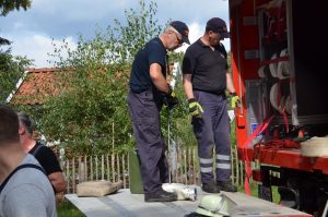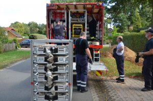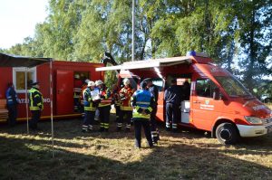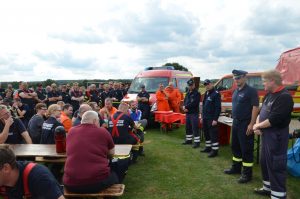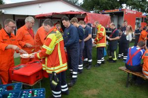 Gegen 13 Uhr endete die Übung mit einer Abschlussbesprechung auf dem Tangendorfer Sportplatz. Der Fachzug Verpflegung hatte hier ein aufwändiges Mittagessen für die etwa 200 Übungsteilnehmer vorbereitet.