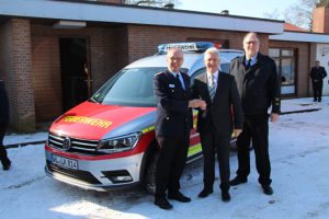 Landkreis Harburg/Hittfeld Ein neues Einsatzfahrzeug für die Kreisfeuerwehr hat jetzt Landrat Rainer Rempe an die Verantwortlichen der Kreisfeuerwehr mit Kreisbrandmeister Volker Bellmann und seinem Stellvertreter Sven Wolkau übergeben. Ein halbes Jahr alter VW Caddy ist jetzt für die Kreisfeuerwehr im Dienst, das optisch auffällige Fahrzeug ist an der Feuerwehrtechnischen Zentrale in Hittfeld stationiert und steht für alle Bereiche der Kreisfeuerwehr zur Verfügung. 40 000 Euro hat der Landkreis Harburg in das Fahrzeug investiert und so für die Kreisfeuerwehr und deren Funktioner eine hervorragende Möglichkeit geschaffen, mit dem Dienstfahrzeug zu Veranstaltungen oder auf Dienstfahrten zu fahren. Aber auch für den Kreisbereitschaftsführer oder dessen Vertreter steht das Fahrzeug für Großübungen oder größere Einsatzlagen zur Verfügung, und auch die technische Einsatzleitung des Landkreises Harburg kann von dem neuen Fahrzeug profitieren. Das neue Einsatzfahrzeug hat eine Motorleistung von 150 PS und erfügt über ein Automatikgetriebe. Eine Standheizung kann im Winter zugeschaltet werden, und für Fahrten in unwegsamen Gelände verfügt der VW Caddy über einen Allradantrieb. Das Fahrzeug ist mit Digitalfunk, Brechwerkzeug und einem Feuerlöscher sowie Absperrmaterialien ausgestattet. Der VW Caddy löst ein Vorgängerfahrzeug VW Transporter aus dem Jahre 1993 ab, das Fahrzeug erlitt im Sommer letzten Jahres einen kapitalen Motorschaden und wurde außer Dienst genommen. Die Beschaffung erfolgte über einen Händler, dort wurden die Verantwortlichen auf ein halbes Jahr altes Fahrzeug aufmerksam, das vom Landkreis gekauft und in viel Arbeit zu einem Feuerwehrfahrzeug umgerüstet und beklebt sowie mit einer Sondersignalanlage Hänsch DBS 4000 ausgestattet wurde. -kpw-